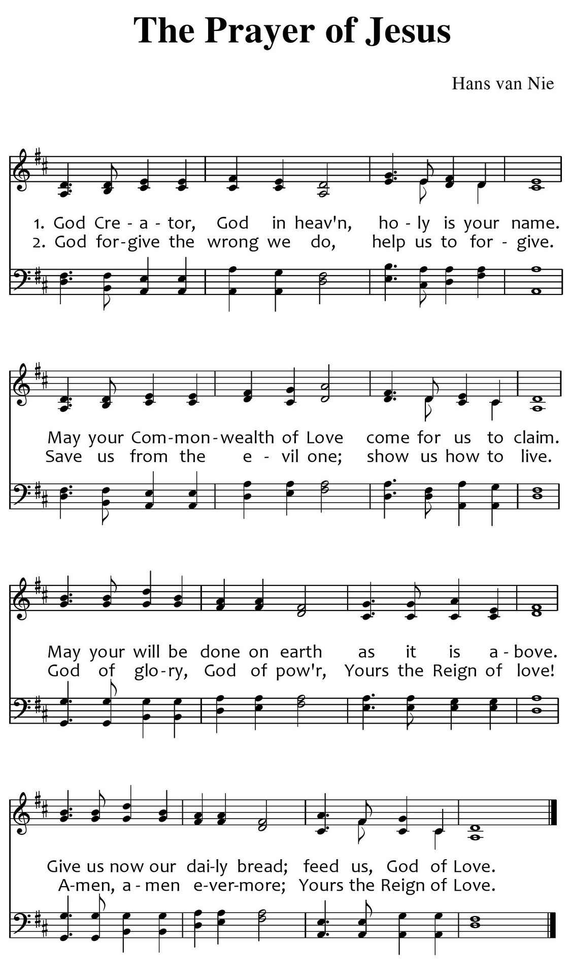 The Christian faith tradition features a foundational prayer, taken from the teachings of Jesus. This prayer sums up some basic aspects of the Christian faith and is used by all Christians in liturgies for communal worship as well as personal devotions. In an attempt to render this prayer in contemporary language, I have composed a musical version which was well-received in the congregations with which I have worked.